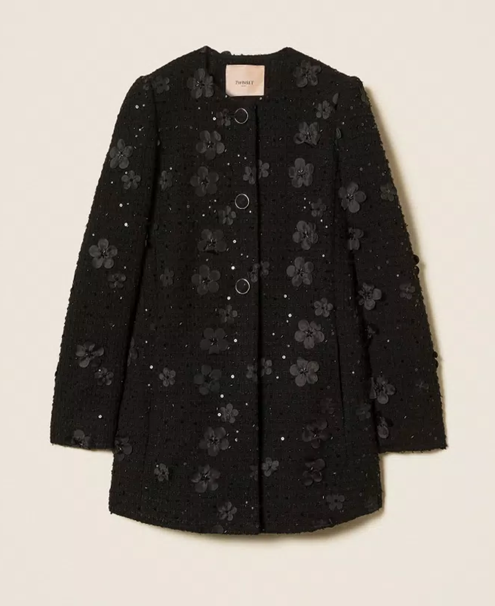 Abito corto in tessuto bouclé con ricamo di fiori tridimensionali. È smanicato con spalline ampie e ha collo squadrato, chiusura con zip invisibile sul retro, fodera, linea dritta.
