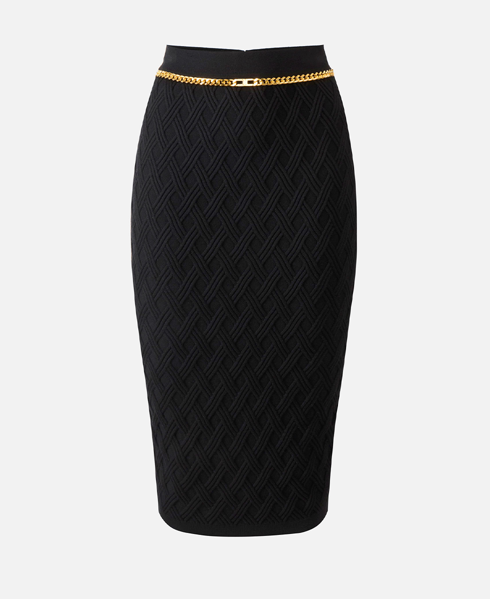 Top in maglia a rombi dalla vestibilità aderente. Si distingue per l’elaborata lavorazione 3D che crea un disegno geometrico a rombi su tutta la lunghezza. Impreziosito dalla catena groumette, ha scollo con zip e tirazip gioiello con logo sul retro.